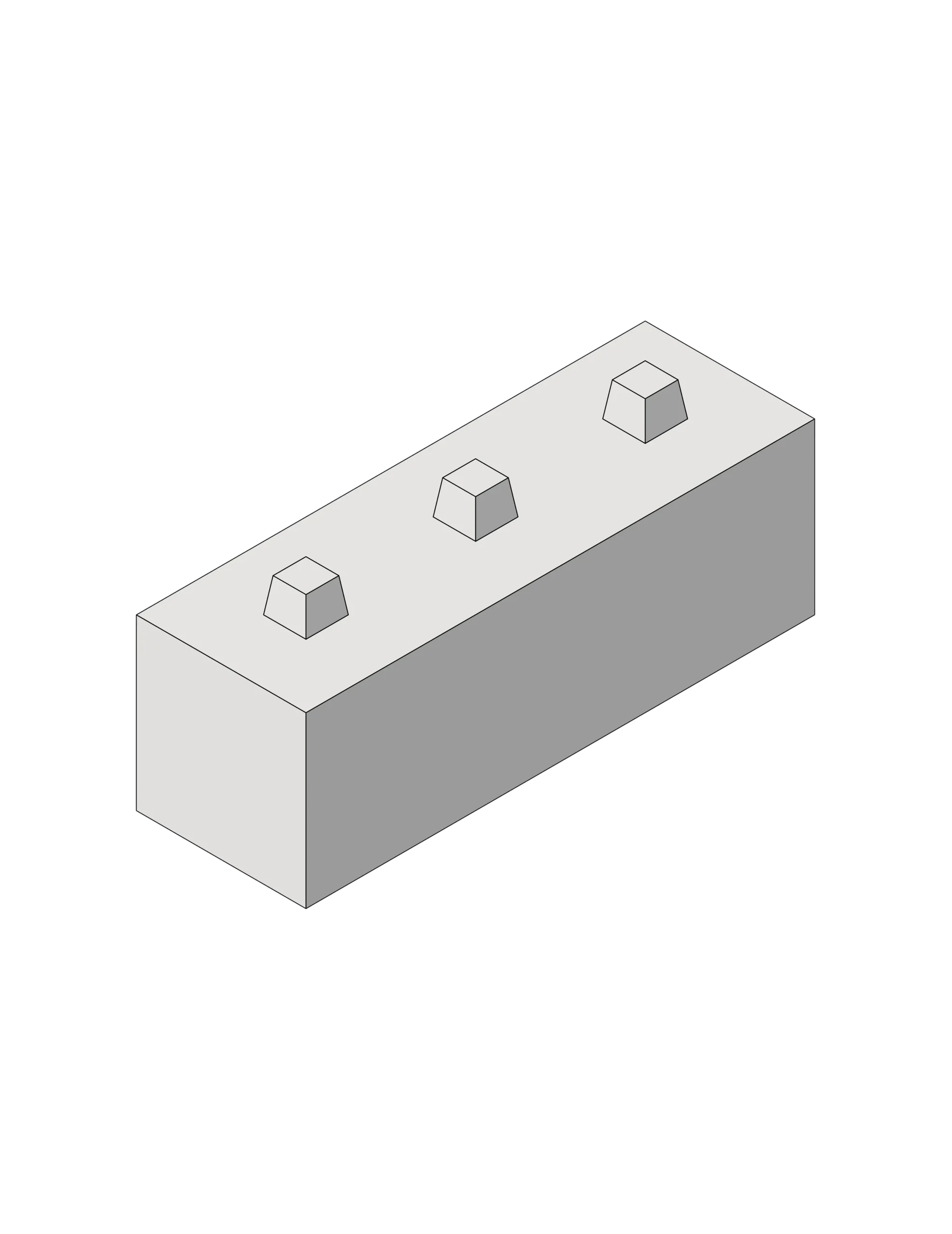Betonstein, mit 1200 mm Länge, 400 mm Breite und Höhe, sechs Noppen auf der Oberfläche und sechs Aussparungen zum stapeln auf der Unterseite