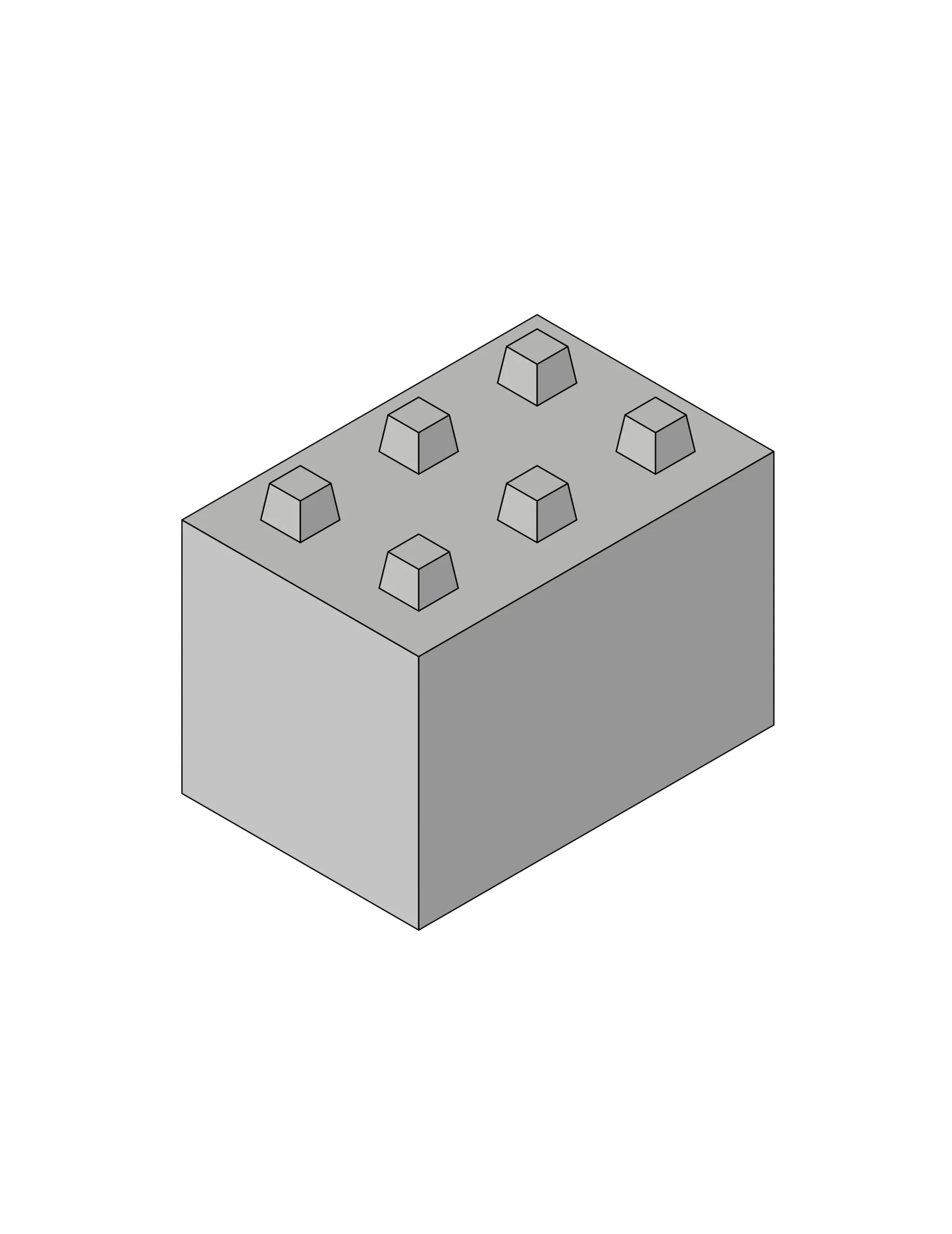 Betonstein, mit 900 mm Länge, 600 mm Breite und 600 mm Höhe, sechs Noppen auf der Oberfläche und sechs Aussparung zum stapeln auf der Unterseite