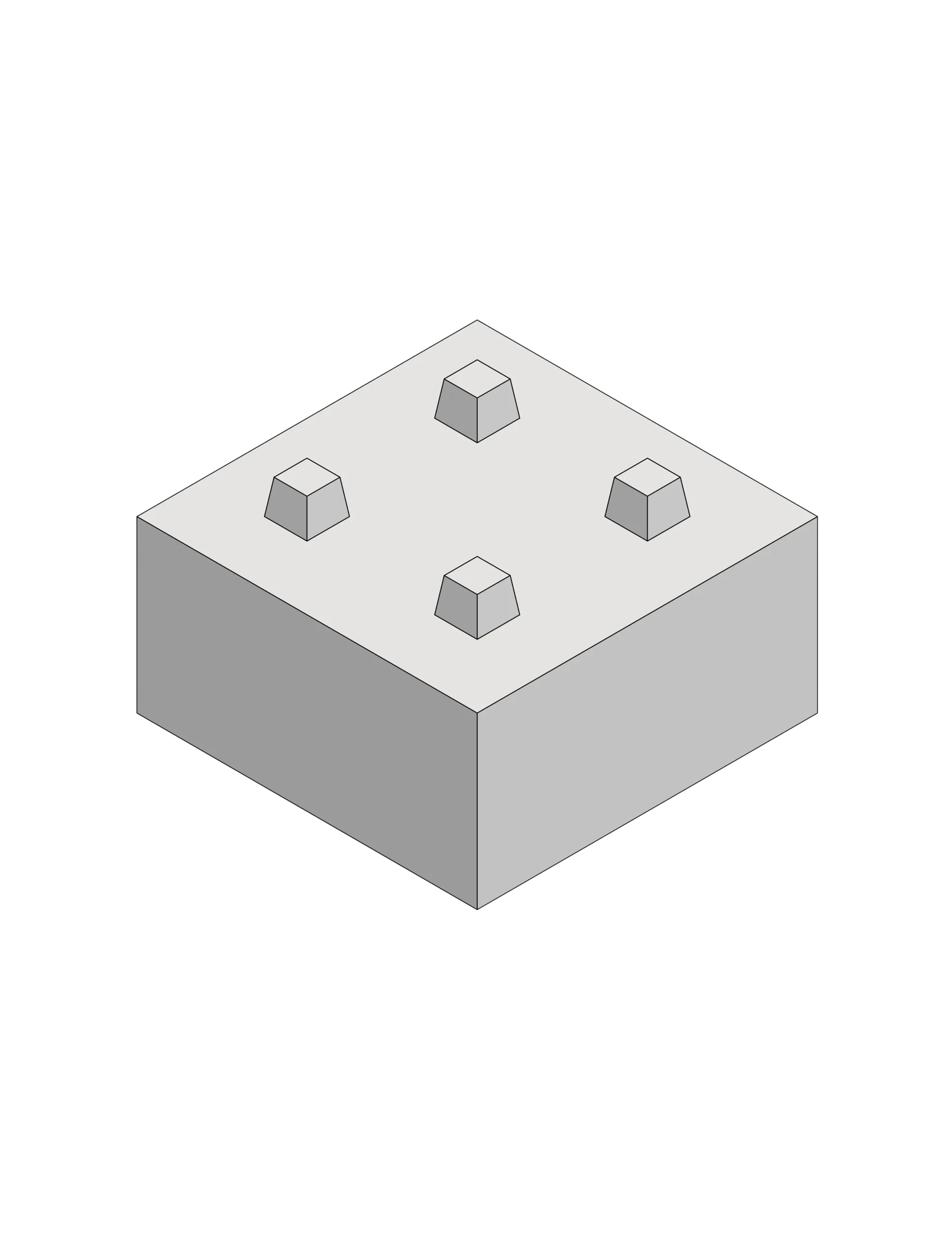 Betonstein, mit 800 mm Länge, 800 mm Breite und 400 mm Höhe, vier Noppen auf der Oberfläche und vier Aussparungen zum stapeln auf der Unterseite