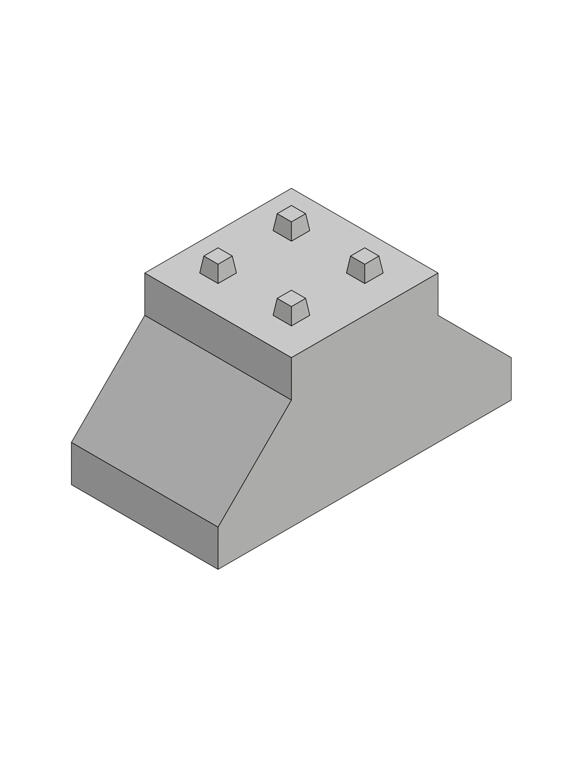 Legonstein, unten eine Länge von 1600 mm und eine Breite von 800 mm, von beiden kurzen Seiten nach oben hin abgeschrägt, dass eine zentral gelegene Oberfläche mit 800 mm Länge und 800 mm Breite mit vier Noppen entsteht, der Stein eine Höhe von 800 mm